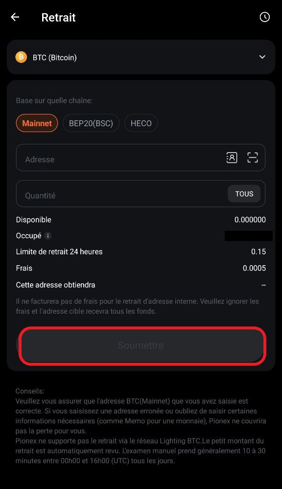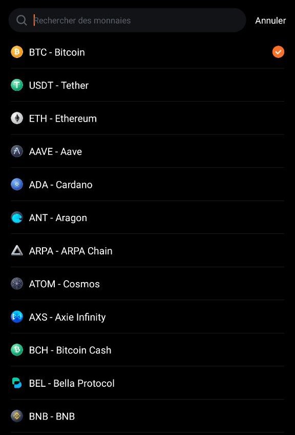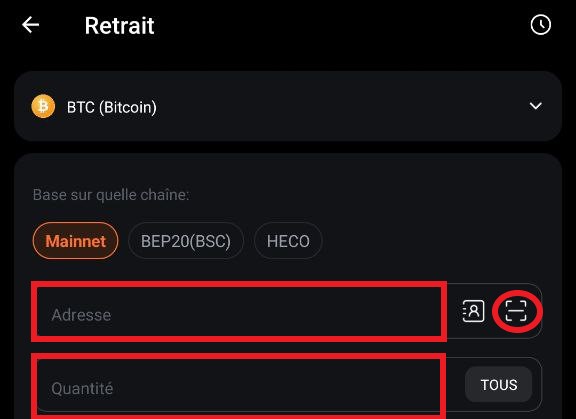 Veuillez prêter spécialement attention à la chaîne du réseau, si vous sélectionnez une chaine incorrecte, les fonds n'arriveront pas, ils seront perdus.