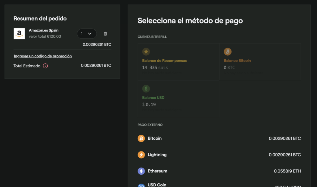 Selecciona el método de pago que deseas usar y sigue las instrucciones. Una vez que el pago haya sido procesado, Bitrefill te proporcionará un código de tarjeta de regalo.