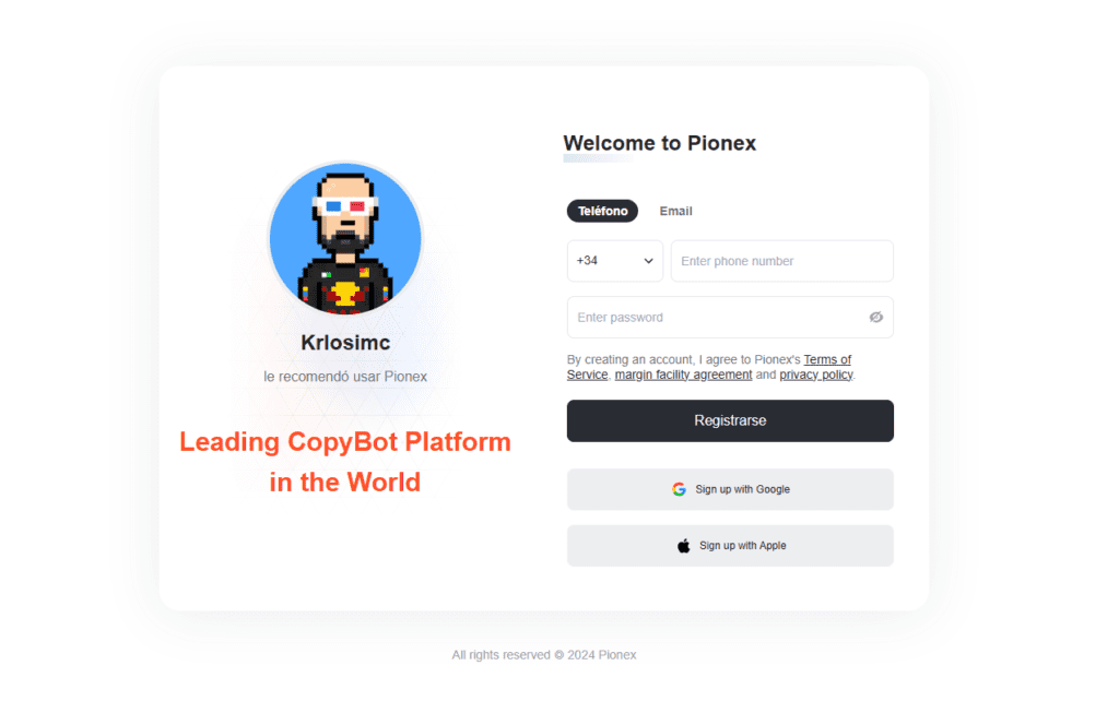 ¿Deseas registrarte? Solo debes seguir este enlace Pionex y te llevará a la página de registro, si te sale la opción Krlosimc le recomendó utilizar Pionex quiere decir que se aplicará un 20% de descuento en las comisiones de por vida, sino sale te recomiendo copiar el link: https://accounts.pionex.com/es/signUp?r=0KxNZfcUoL7 y pegarlo en otra web o una ventana privada para asegurarte de que estás utilizando el código correcto.