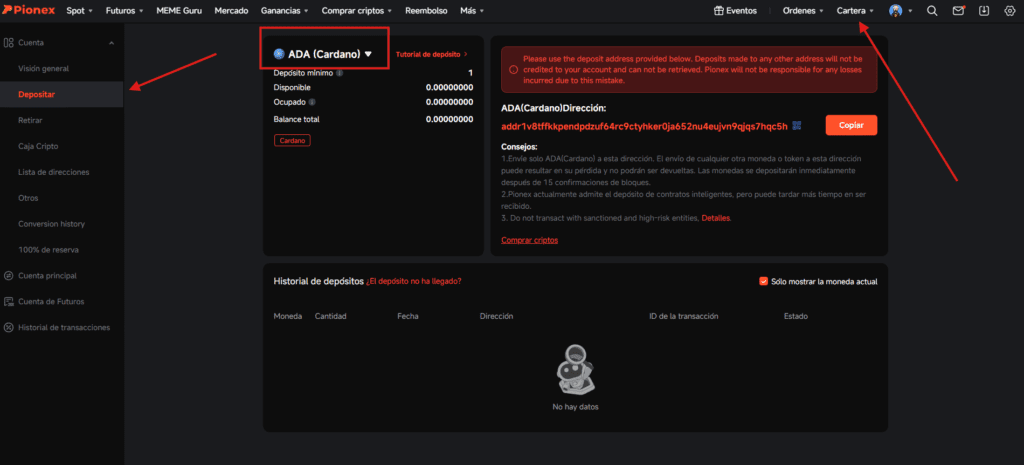 El proceso de depósito en Pionex es muy sencillo, una vez iniciada nuestra sesión nos dirigimos a Cartera luego Depositar y seleccionamos la moneda del listado, copiamos dirección y asegúrate de seleccionar la red correcta.